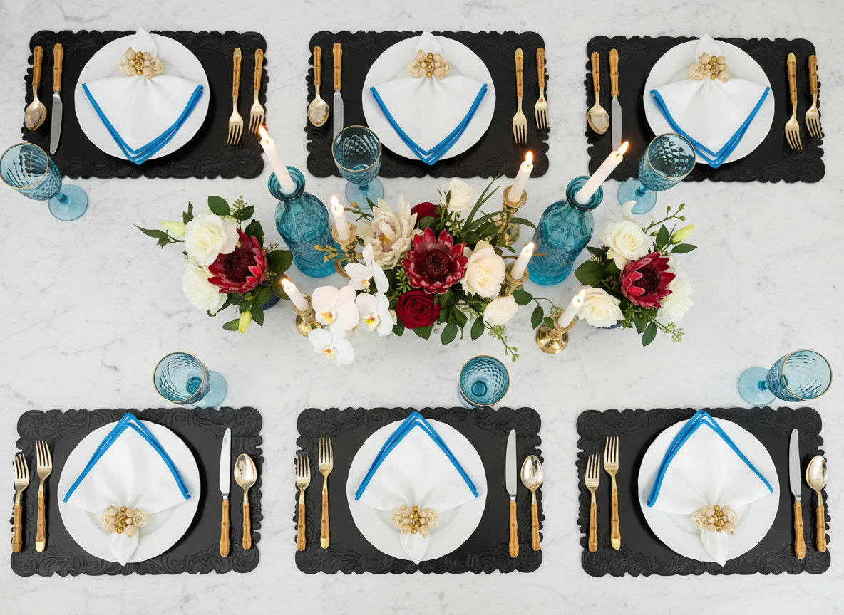 Glamourise your dining experience with our set of four Black Embossed Faux Leather Rectangle Placemats. These exquisitely crafted placemats bring a touch of sophisticated luxury to any table setting. Their durable material ensures longevity, making them ideal for even the busiest tables. Plus, they're wonderfully easy to care for and maintain. Add a touch of timeless elegance to your table with this perfect set.