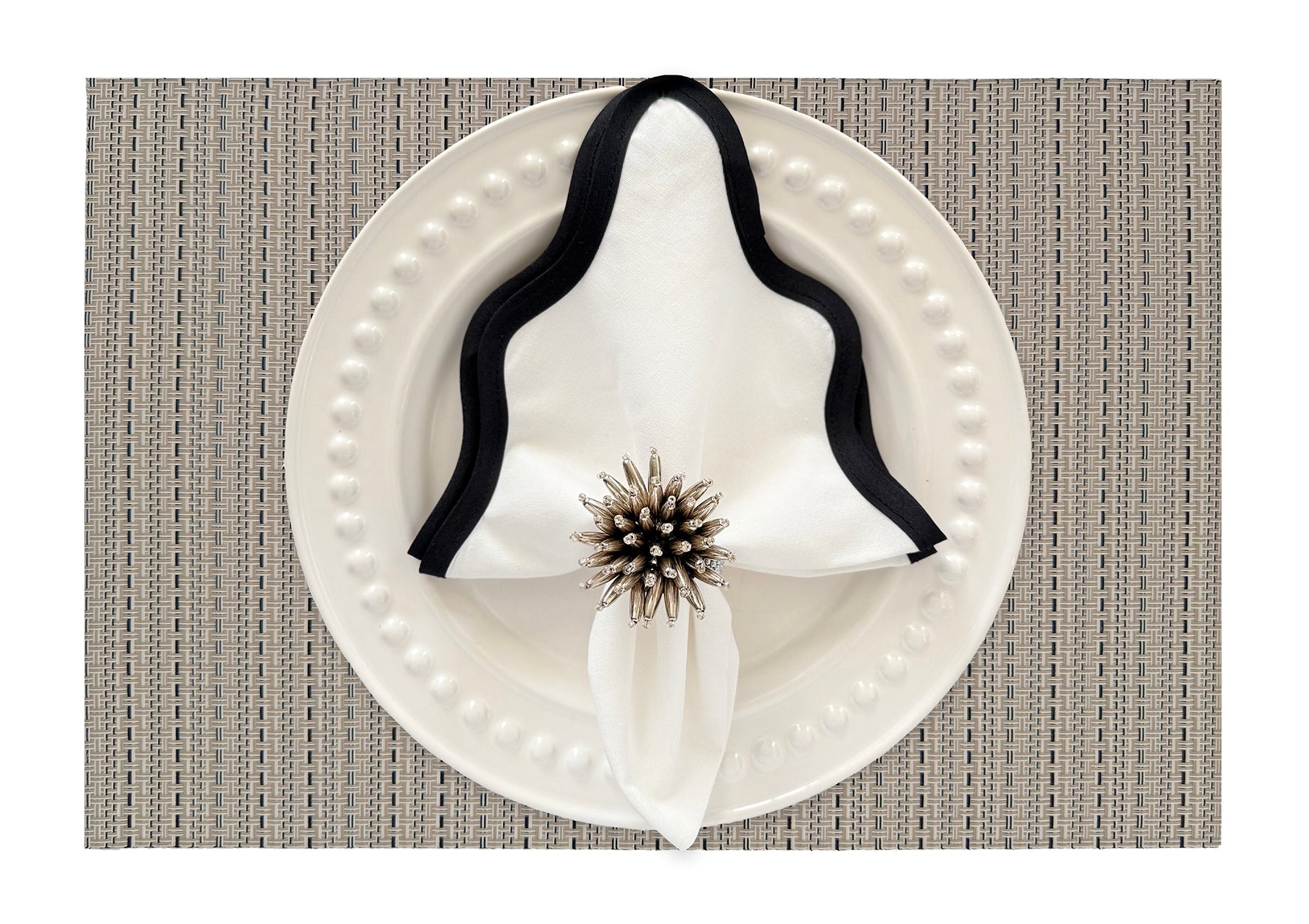 Enhance your table setting with our White and Black weave Rectangle Placemat set. These intricately woven placemats exude opulence and sophistication, elevating any dining experience. Crafted from durable material, they are perfect for busy tables and are conveniently easy to care for and wash. With a set of 4, it's the ideal addition for a lavish table setting.