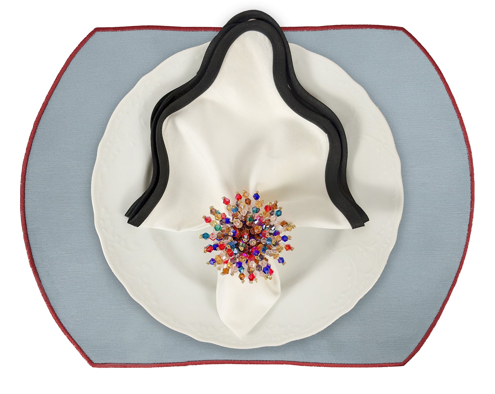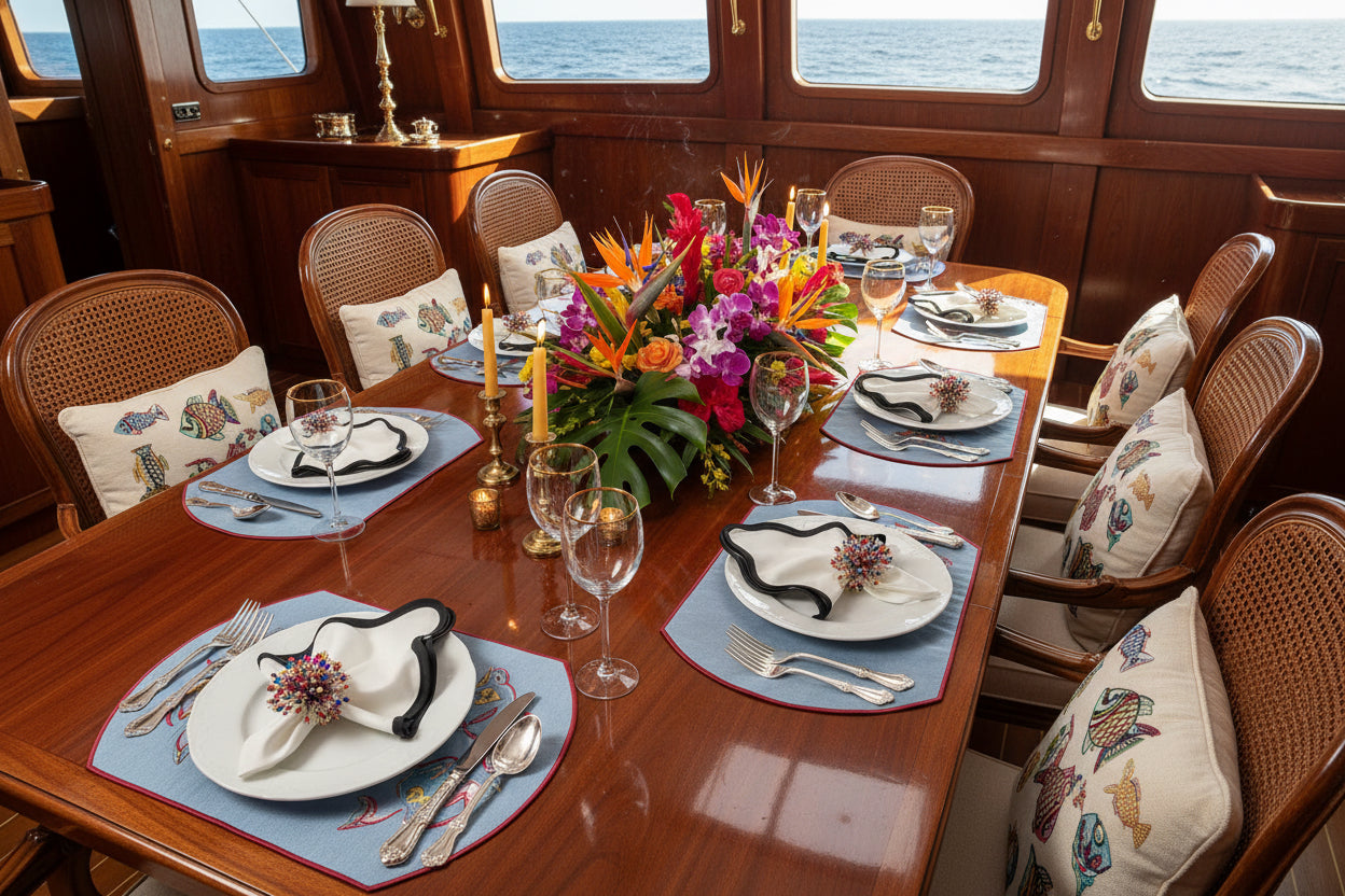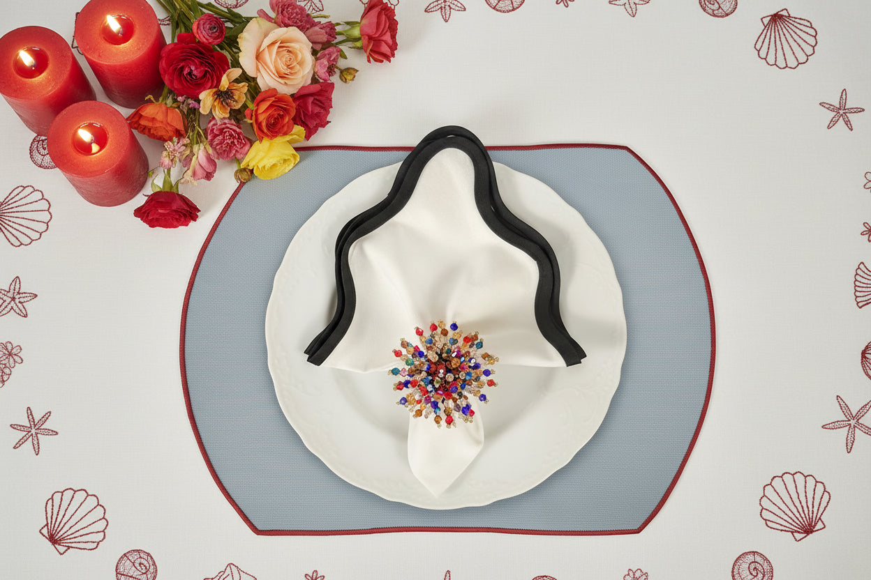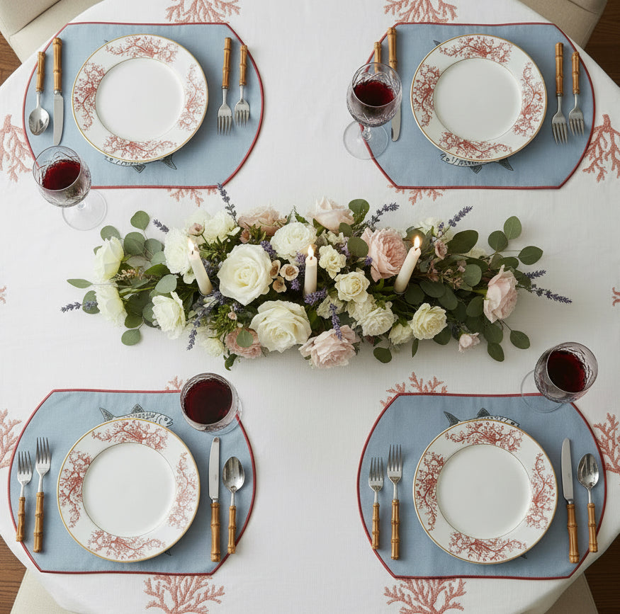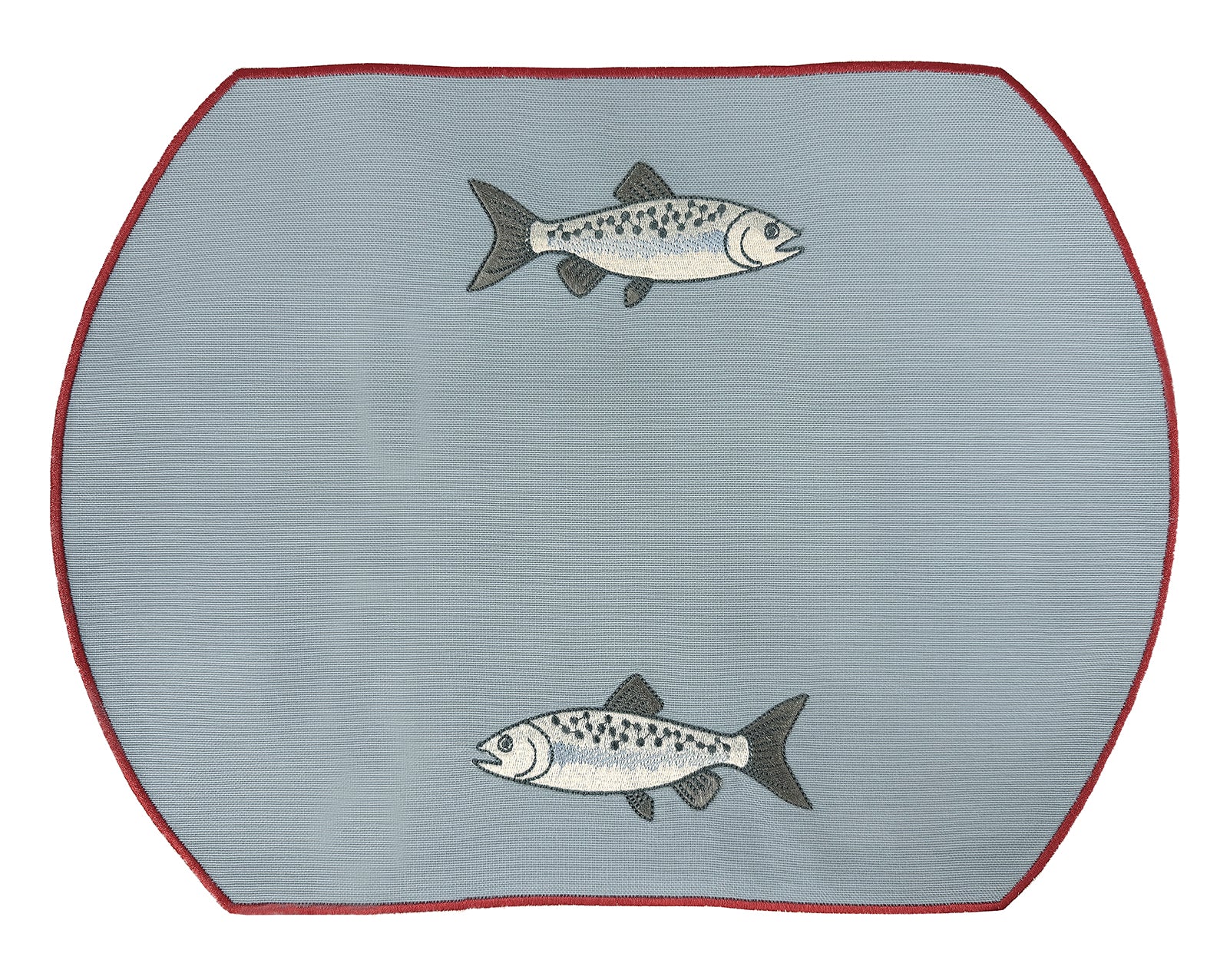 Infuse your dining experience with coastal charm through this distinguished set of four embroidered placemats, each featuring intricately detailed mackerel motifs. Rendered in a refined denim blue palette, with bright Red edging trim, these placemats capture the essence of maritime elegance whilst maintaining a timeless sophistication that enhances any table setting. The carefully executed embroidery celebrates the beauty of marine life, transforming your dining table into a curated showcase of refined taste and artistic appreciation. Ideal for those who cherish nautical aesthetics, these versatile pieces work beautifully in both contemporary and traditional interiors, seamlessly complementing your existing décor. Whether you're hosting an intimate dinner party, a seaside-inspired gathering, or simply elevating your everyday meals, these placemats serve as both functional table linens and artistic statements. Their understated elegance and thoughtful design make them an investment in creating memorable dining moments that reflect your discerning eye for quality and style.