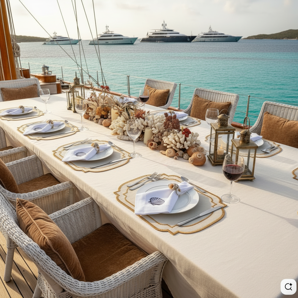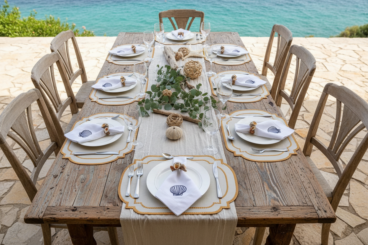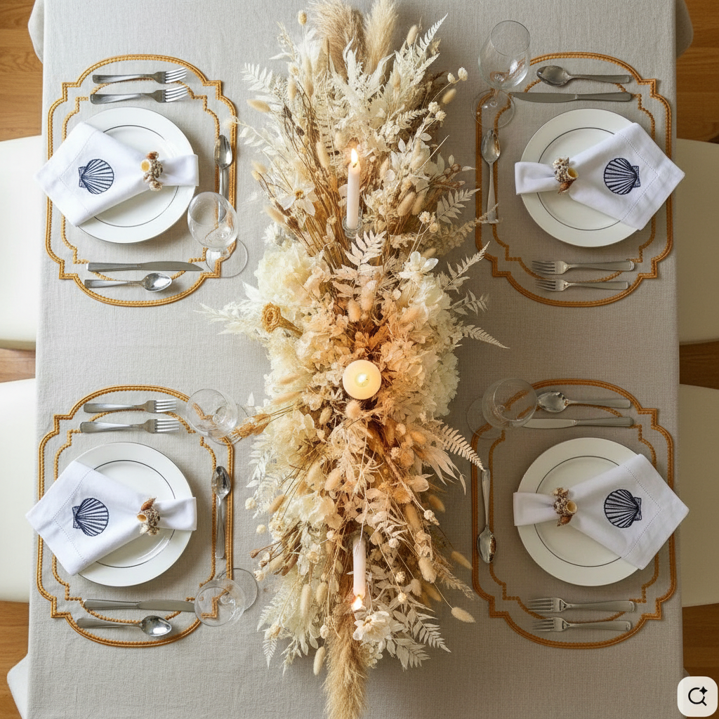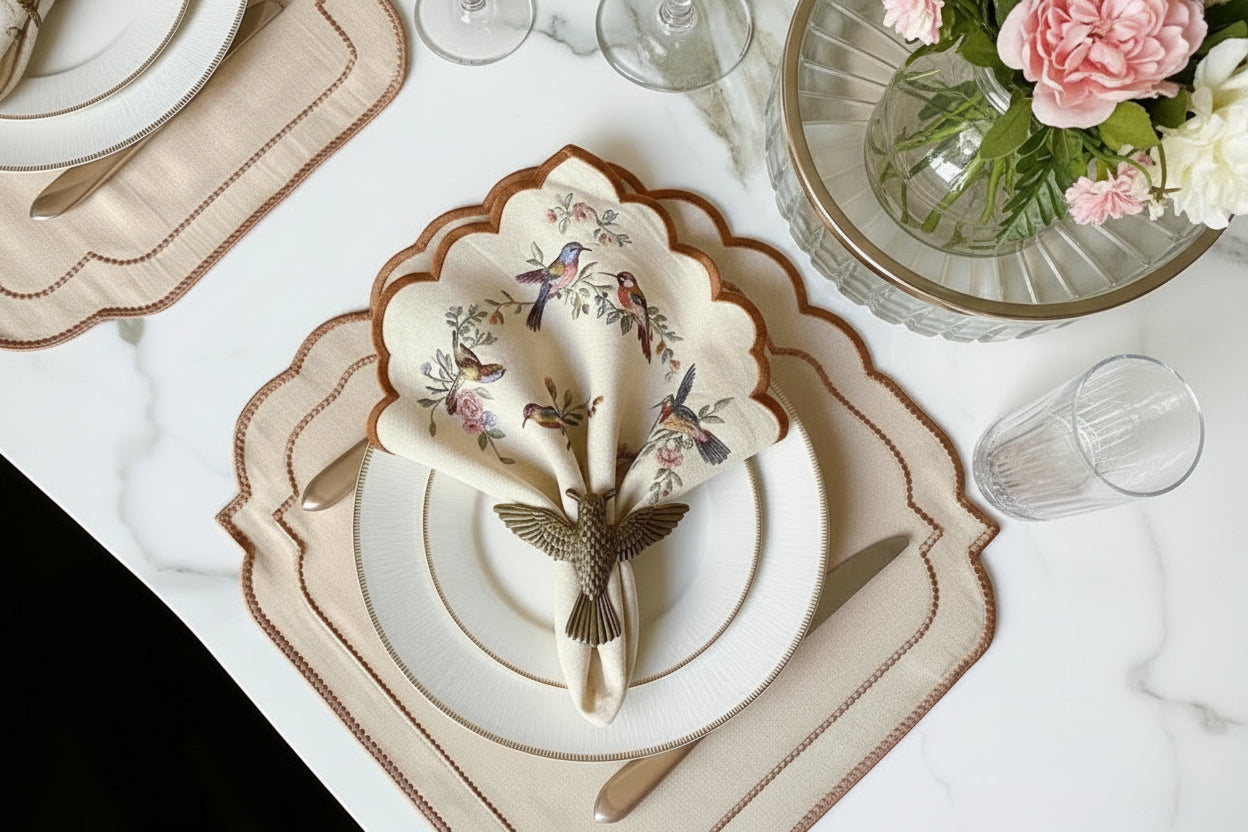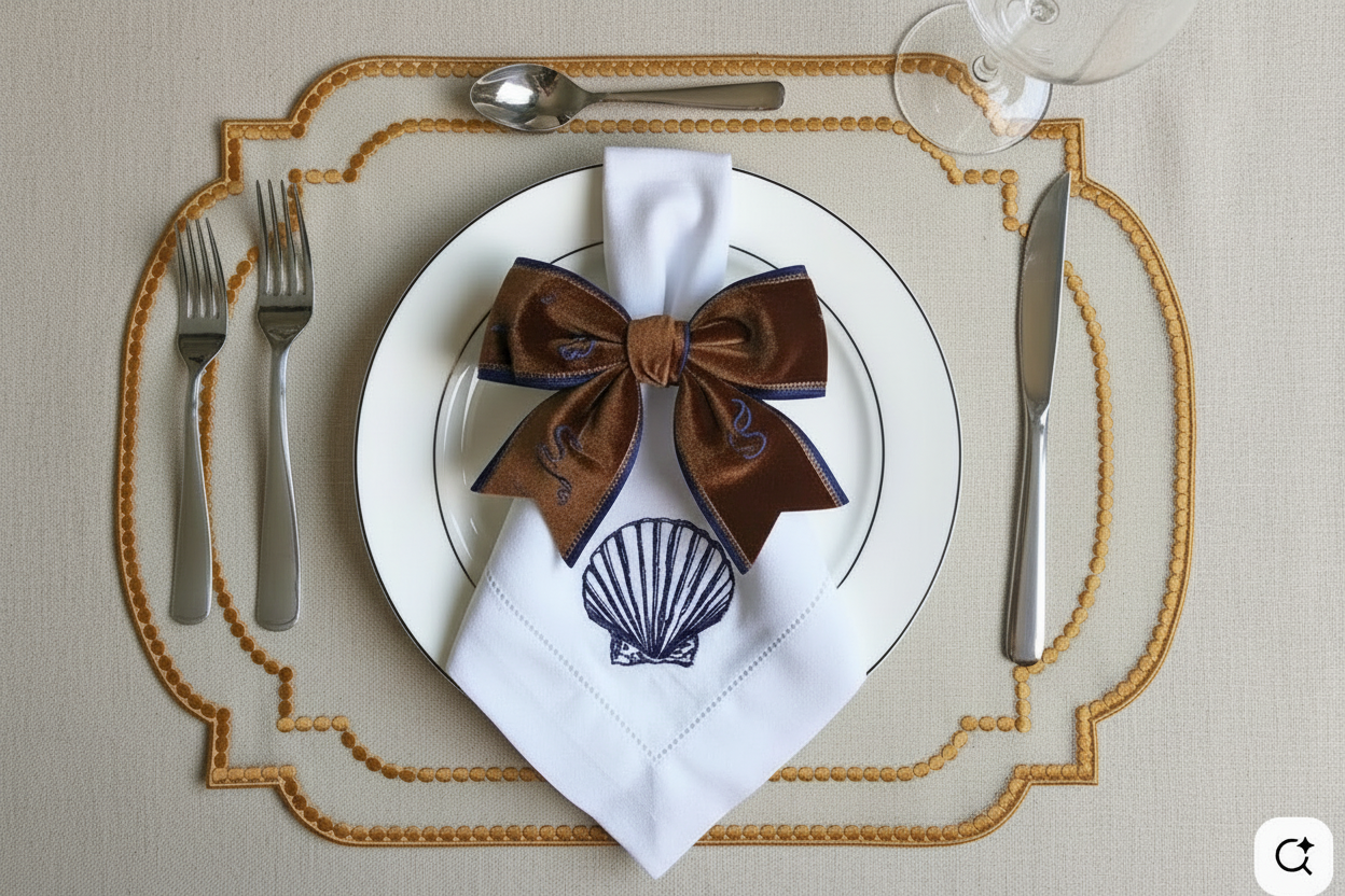 Add a sprinkle of celestial magic to your table with this charming set of four ivory placemats. Each rectangular piece features a delightful constellation of bronze stars embroidered along the edges in shimmering metallic thread, creating a whimsical yet refined aesthetic. Generously sized to accommodate your finest dinnerware and cutlery, these placemats bring a touch of starlit wonder to any occasion. From intimate dinner parties to grand celebrations, they effortlessly elevate your table setting with their playful elegance. The warm bronze embroidery against the soft ivory background creates an inviting atmosphere that feels both special and approachable. Perfect for those who believe entertaining should be joyful, these versatile pieces transform ordinary meals into memorable moments under the stars. Whether you're hosting a formal wedding dinner or entertaining on a luxury superyacht, these placemats prove that sophistication can be fun.
