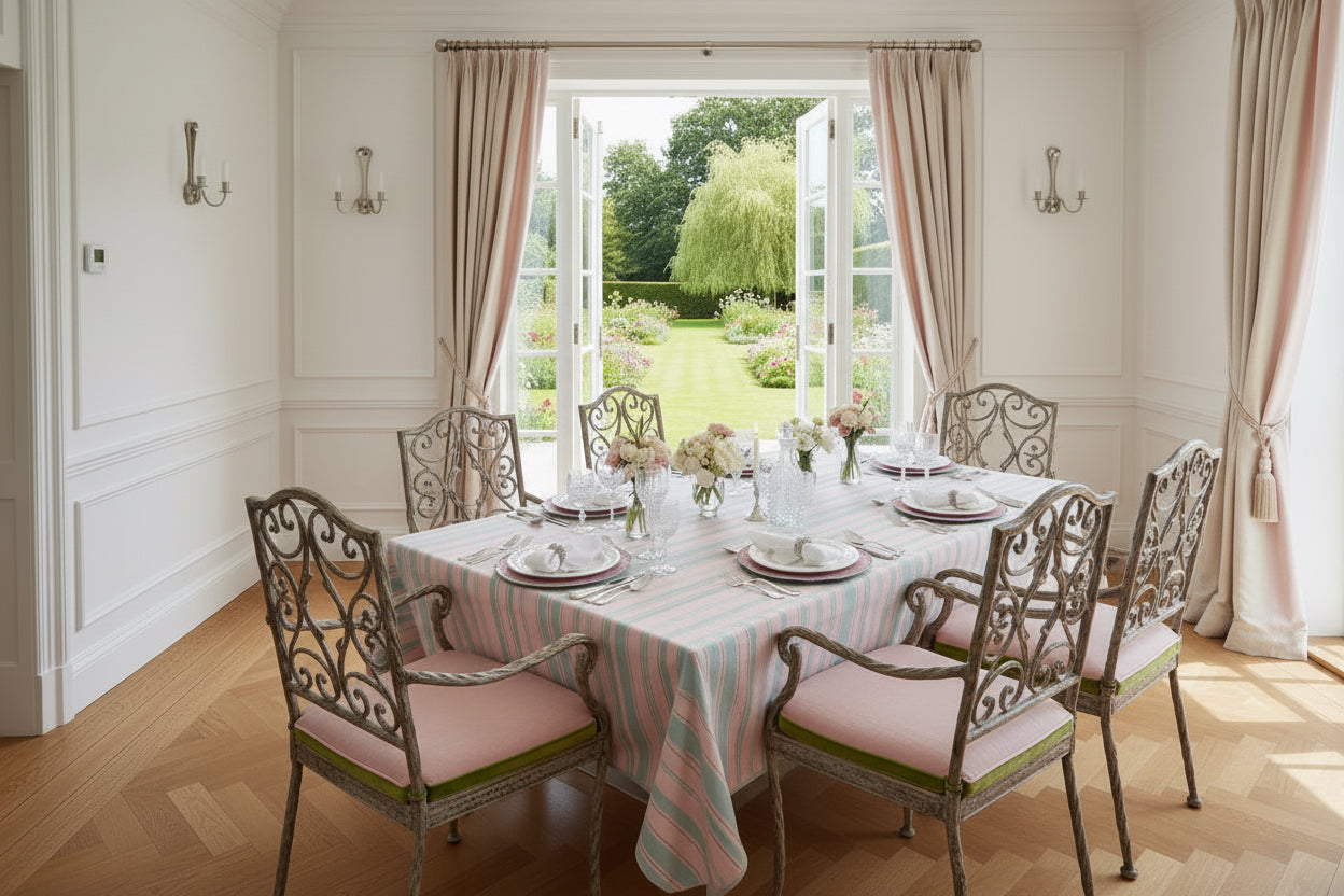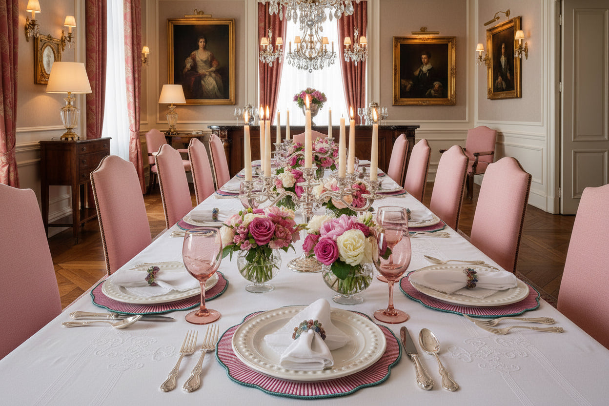 Transform your dining experience with this refined set of four embroidered placemats, each featuring elegantly scalloped edges. The sophisticated design combines a luminous turquoise metallic trim with soft pink stripes and an understated apricot pattern that exudes timeless elegance. These versatile pieces gracefully frame your dinnerware while adding a refined touch to any table setting, from intimate gatherings to formal occasions. Complement your table with our coordinating napkin rings to create a cohesive, polished aesthetic that speaks to your refined taste.