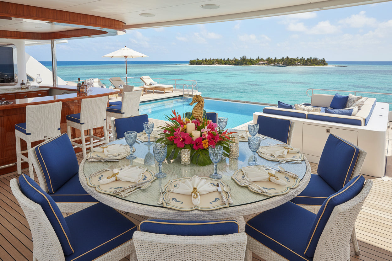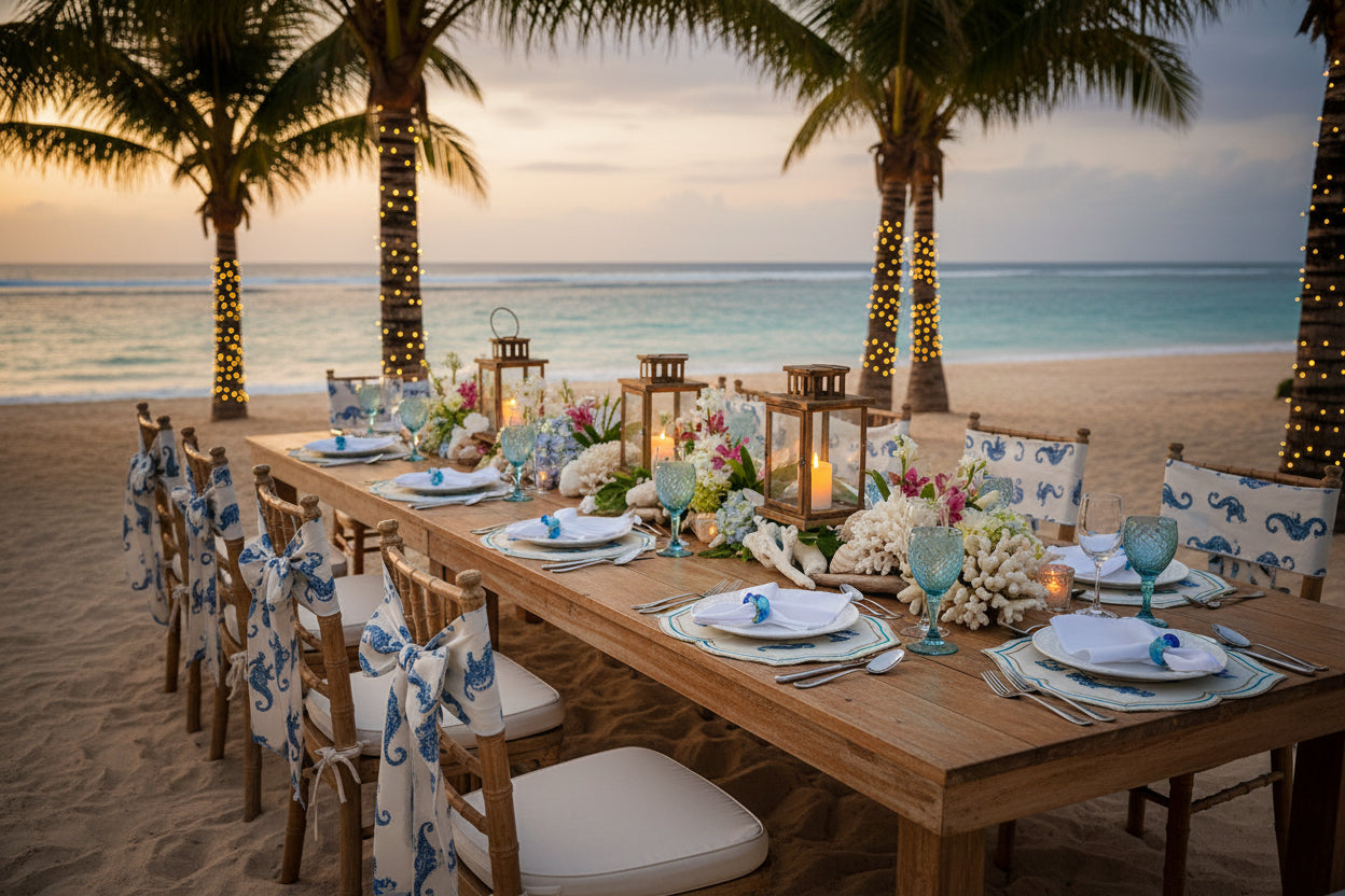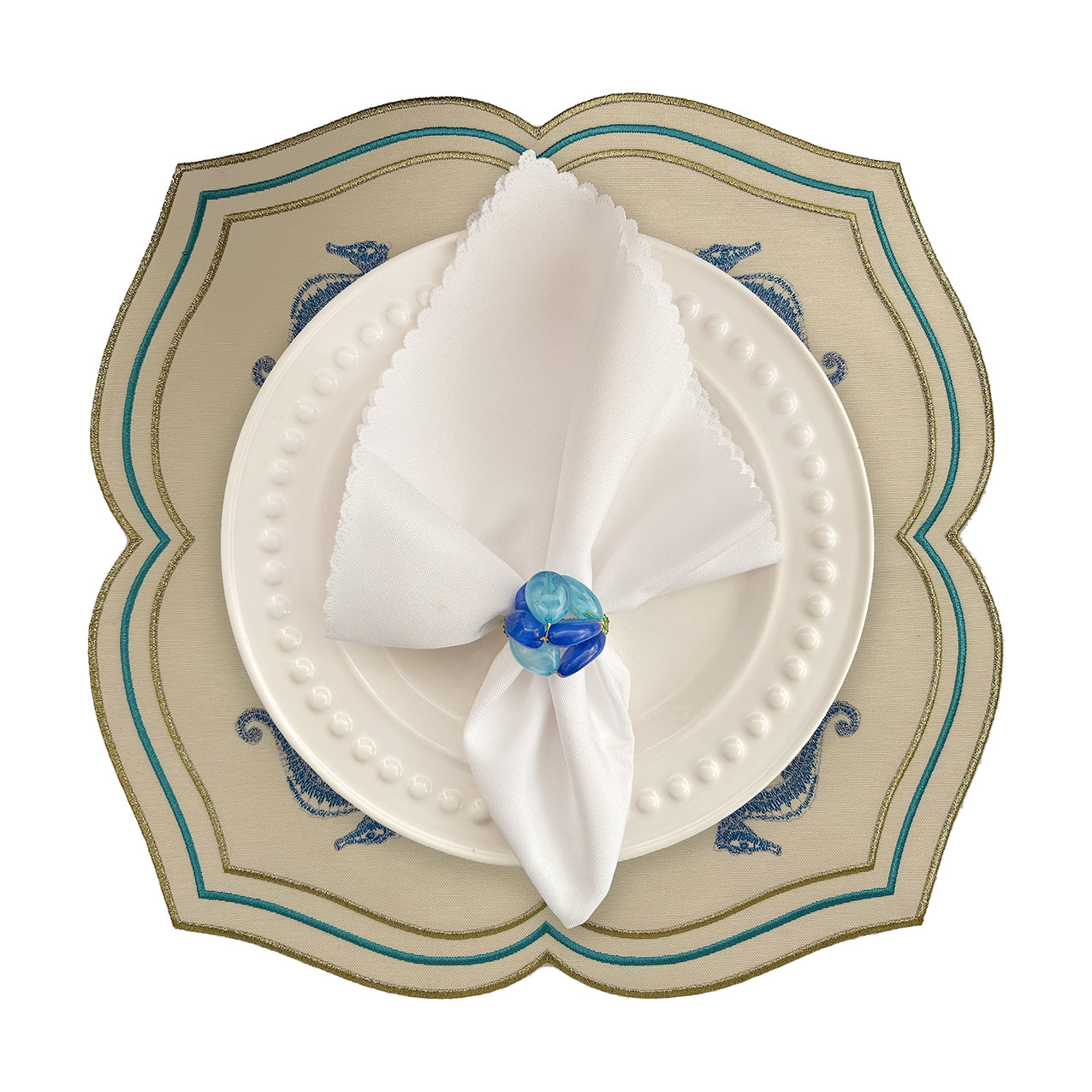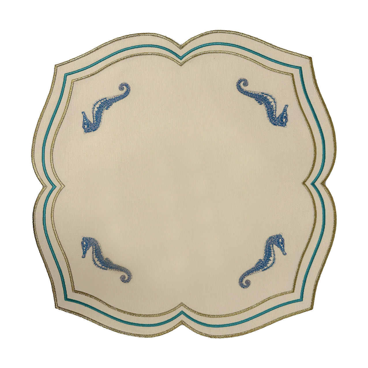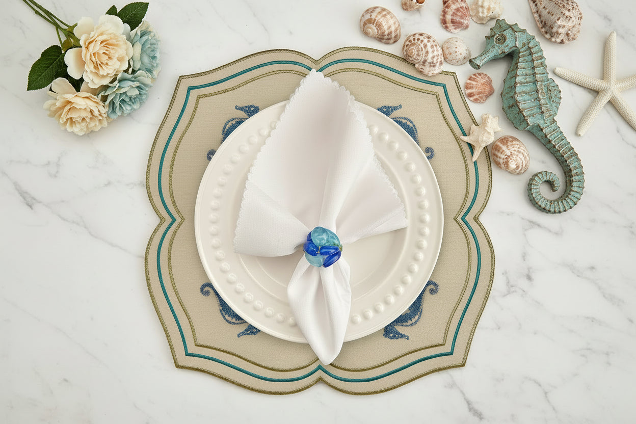 Make a splash with this enchanting set of four seahorse placemats that celebrate the magic of the ocean. Each square piece features gracefully scalloped edges and a sculptured silhouette adorned with four beautifully embroidered seahorses in shimmering blue and silver. Metallic gold and turquoise threading frames the design, creating a luminous effect that catches every glimmer of candlelight. These whimsical yet refined placemats bring instant coastal joy to any table setting, transforming ordinary meals into seaside adventures. Perfect for beach-themed celebrations, coastal weddings, villa entertaining, or Super Yacht gatherings, they infuse your dining experience with playful maritime charm. The thoughtful combination of colours and intricate embroidery proves that elegance can be fun and imaginative. Whether you're hosting an intimate dinner or a larger soirée, these placemats spark conversation and create an atmosphere of relaxed sophistication. Dive into entertaining with pieces that make your guests smile and your table unforgettable.