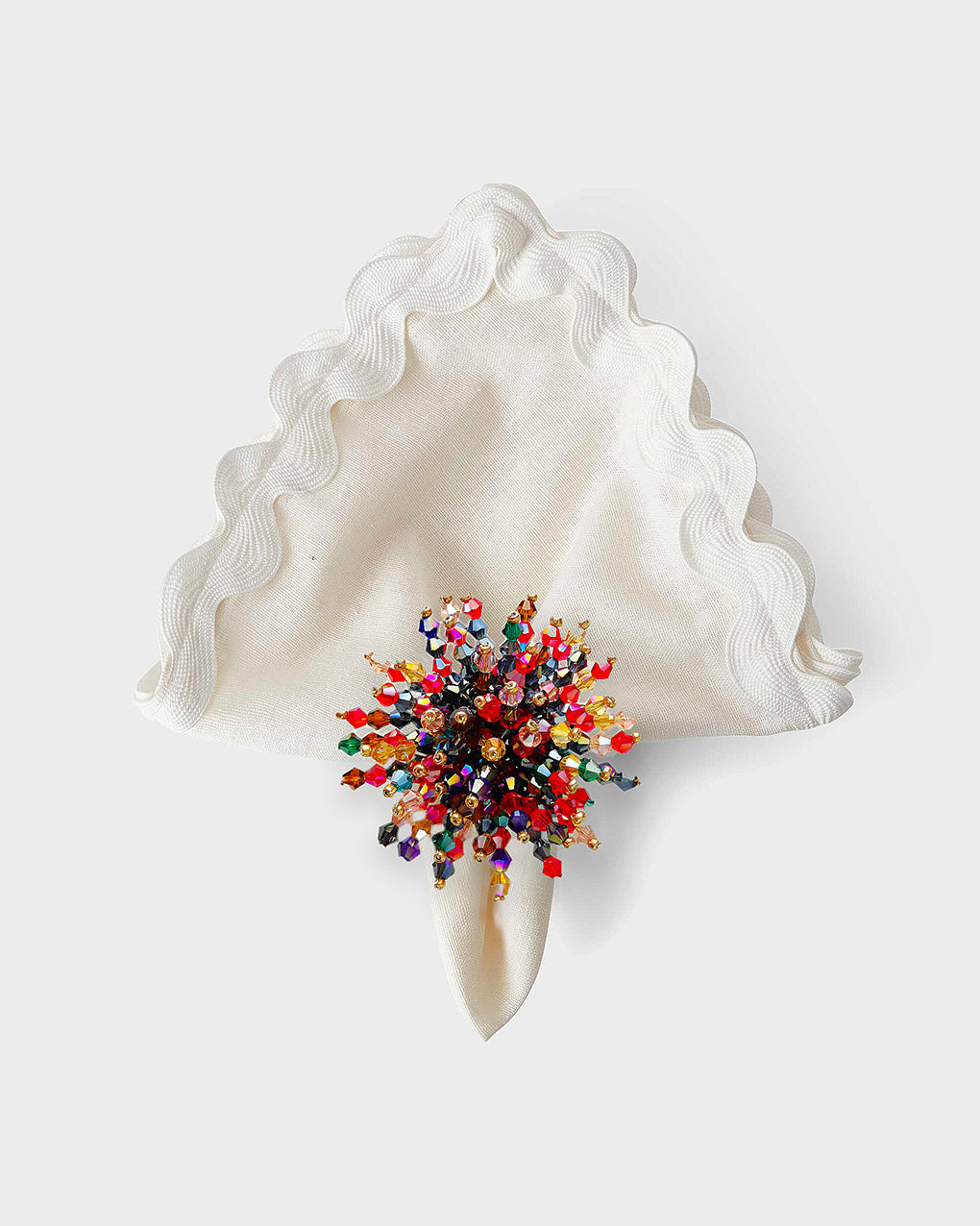 The Las Vegas Napkin Ring. Get ready to add some serious fun to your table with this cheerful set of four napkin rings! Packed with a rainbow of beads that fan out like a joyful flower bursting with personality, these rings bring instant colour and whimsy to any Tabelscape. Whether your style is quirky, classic, or somewhere in between, these vibrant beauties play nicely with every aesthetic. Mix and match with our placemats to create a table setting that's as playful and unique as you dare be!.