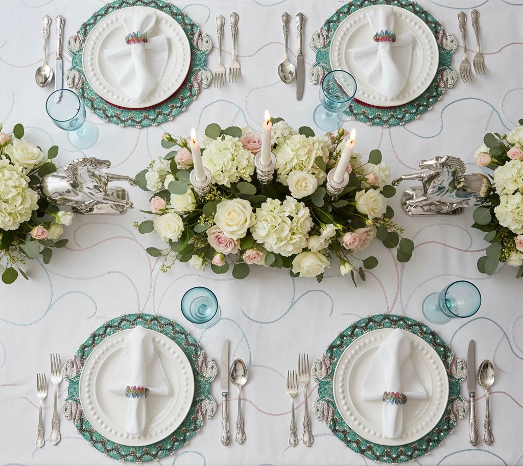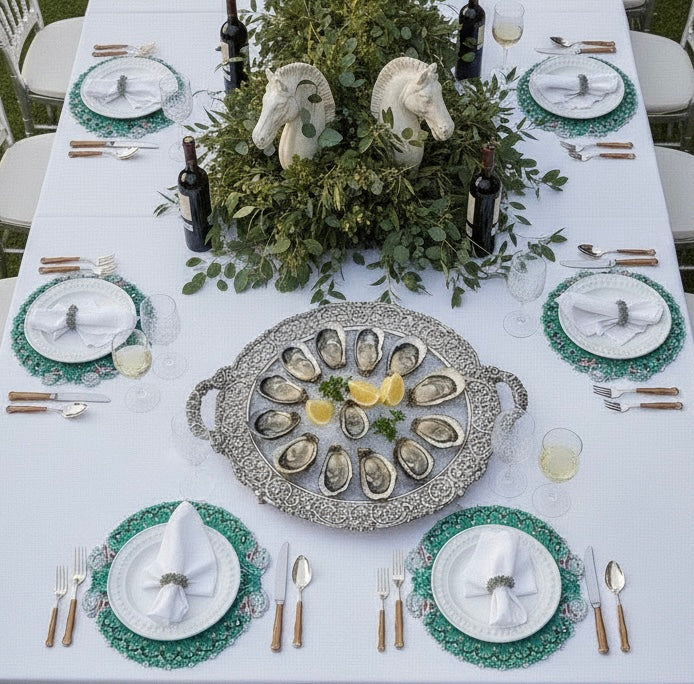 Transform your table into a conversation starter with this delightful pair of beaded placemats, each featuring a charming horse head design framed by vibrant turquoise beadwork. The playful aesthetic brings personality to any dining space whilst coordinating beautifully with existing décor. Soft felt backing keeps your table protected and scratch-free, adding both style and practicality. Every placemat is individually handcrafted, meaning each piece carries its own unique character and subtle variations—a testament to hours of artisanal work. Complete the whimsical look with our coordinating napkin ring for a table setting that's truly one-of-a-kind.
