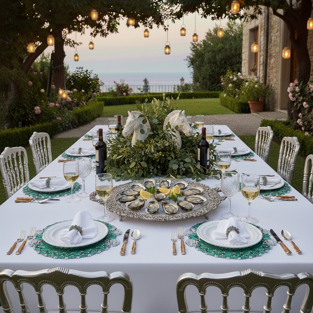 The Horse Play beaded placemat features horses head, and multi Turquoise beaded pattern trim. Great fun and truly unique table setting, with colours to match most table decors. Felt backing to add a soft touch to any table, and added non scratch properties. We have a matching napkin ring, to complete the look.