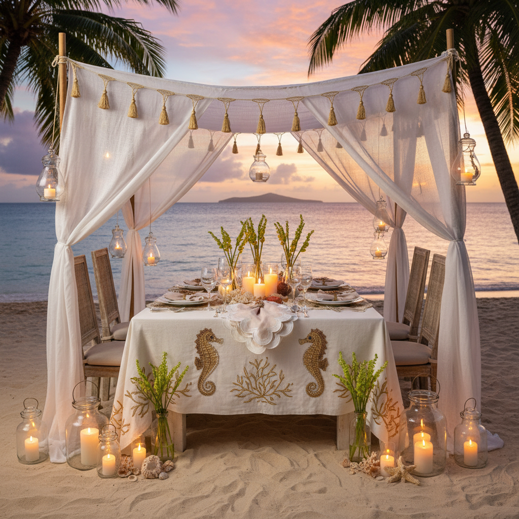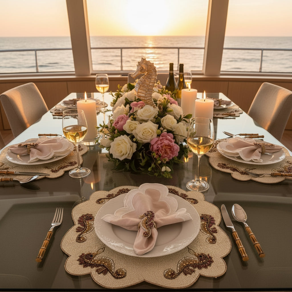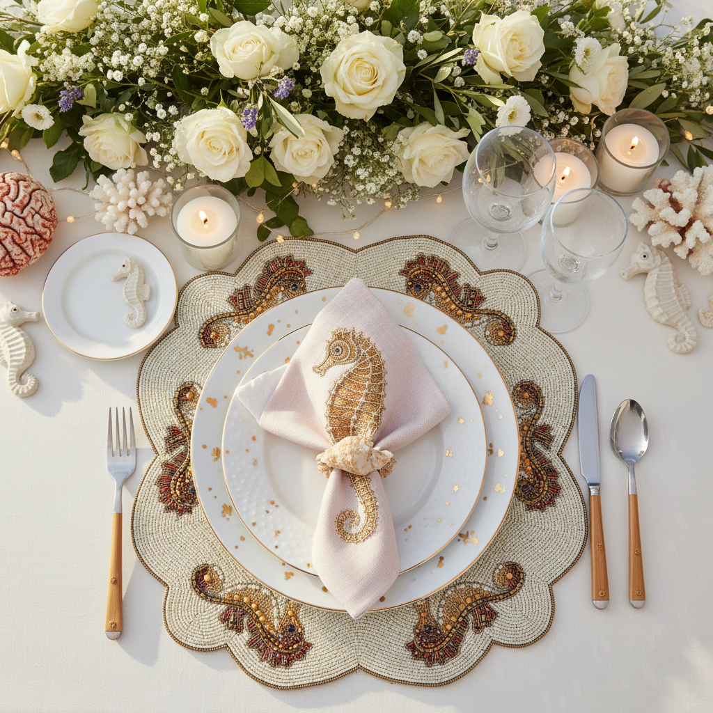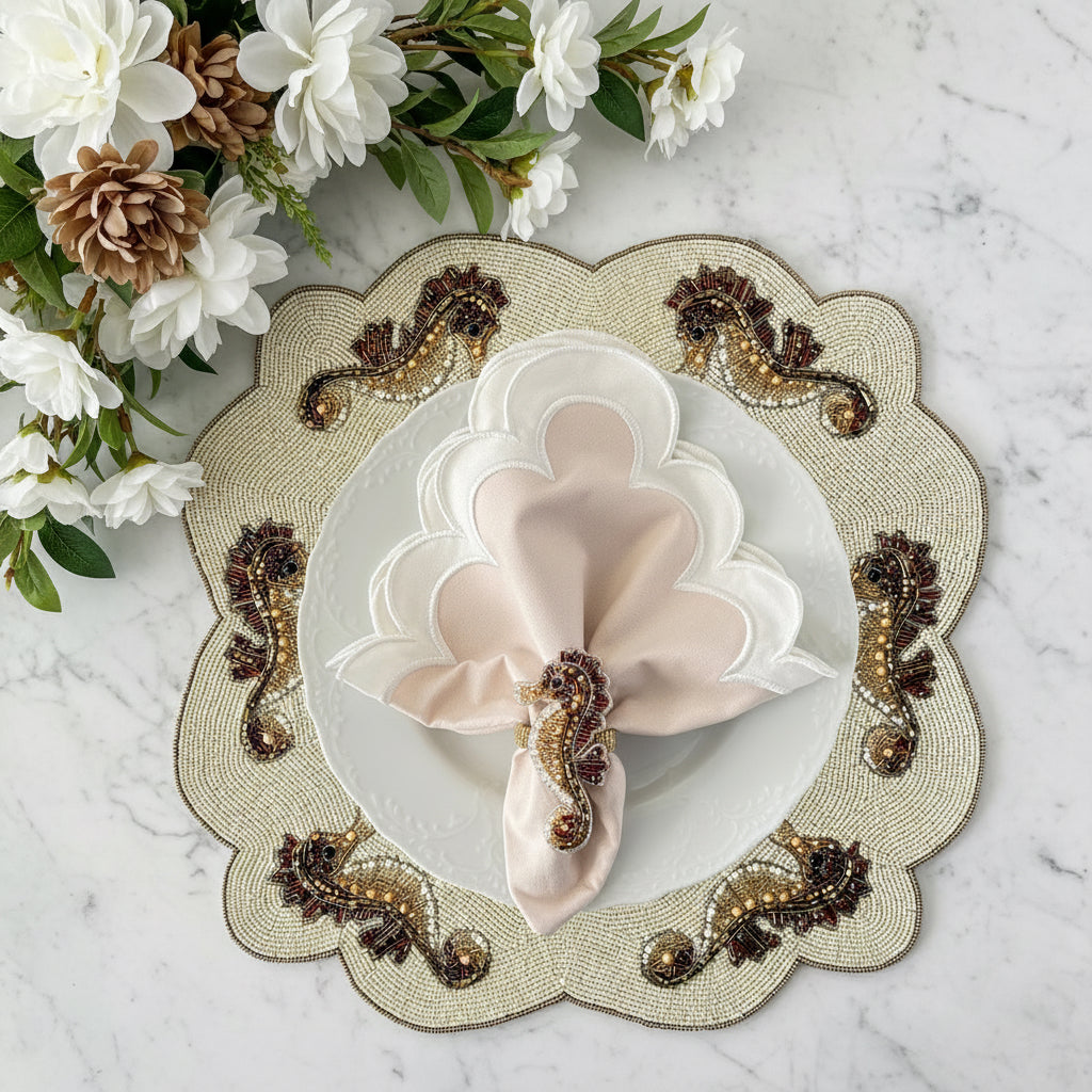 Dive into dining elegance with these charming seahorse beaded placemats that bring coastal magic to your table. Crafted by hand with meticulous care, they sparkle and shimmer like treasures from the sea, catching light in the most delightful ways. Whether you're hosting a seaside celebration or simply want to add a splash of whimsy to weeknight dinners, these beauties deliver instant glamour. The soft felt backing keeps your table protected from scratches, whilst the matching napkin ring lets you complete the look with playful flair. Each handmade placemat is wonderfully unique—subtle differences in shape and beadwork aren't imperfections, but charming reminders of the artistry poured into every piece.