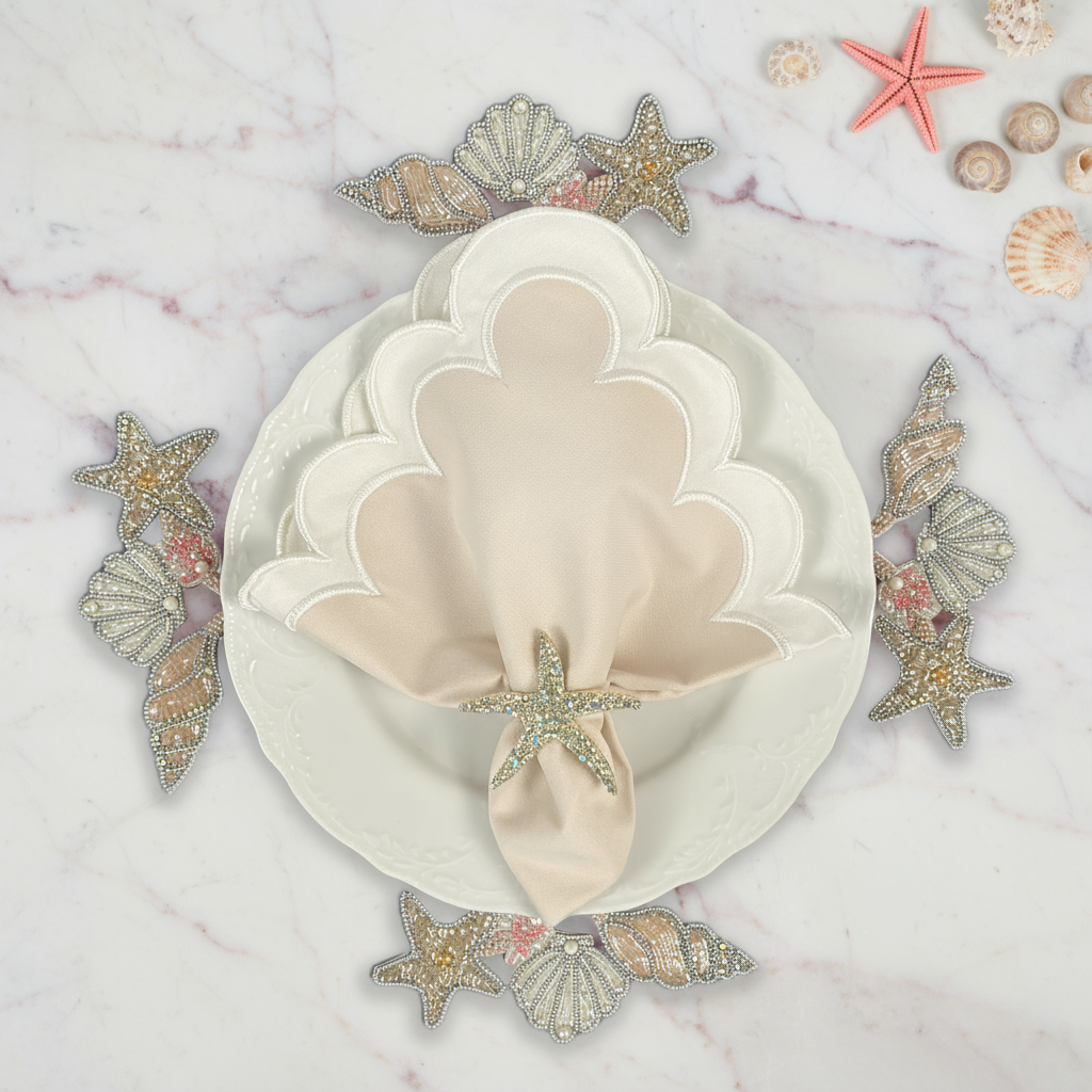 The Starfish Napkin Ring will introduce a coastal charm to your dining experience with this refined set of four Starfish Napkin Rings. Crafted with gleaming rhinestones that radiate brilliance from every angle, these elegant accessories bring a touch of maritime sophistication to weddings, seaside celebrations, and upscale entertaining. Whether adorning tables at a villa or aboard a Super Yacht, each ring serves as a graceful finishing detail that elevates your table presentation with understated luxury.